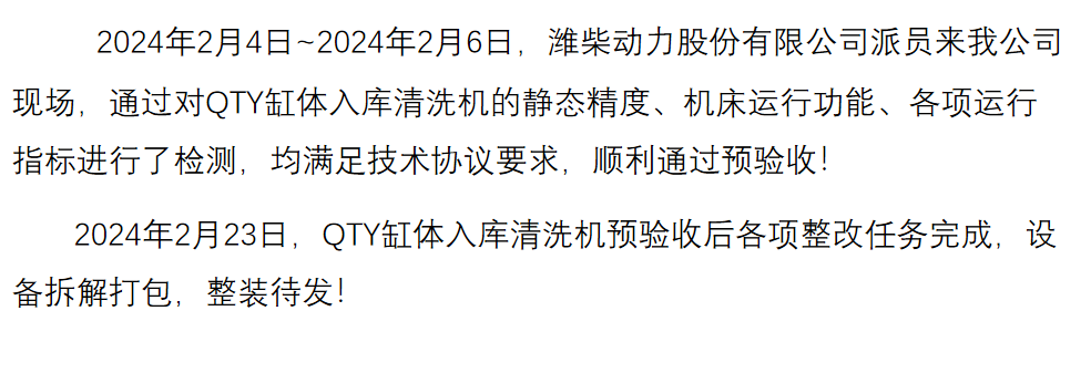 熱烈祝賀濰柴動力股份有限公司QTY線缸體入庫清洗機順利通過預驗收,整裝待發(fā)!