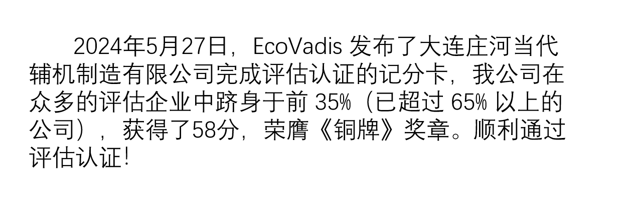 熱烈祝賀大連莊河當(dāng)代輔機(jī)制造有限公司順利通過(guò)EcoVadis評(píng)估認(rèn)證